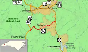 North Carolina Highway 116 (NC 116) is a primary state highway in the U.S. state of North Carolina. The highway runs east–west but is signed south–north, connecting the town of Webster between two major highways in Jackson County.