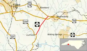 North Carolina Highway 120 (NC 120) is a primary state highway in the U.S. state of North Carolina. The highway connects the community of Cliffside and the town of Mooresboro.