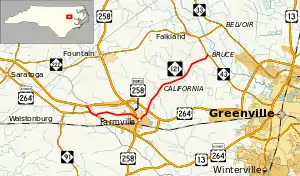 North Carolina Highway 121 (NC 121) is a 13.2-mile-long (21.2 km) primary state highway in the U.S. state of North Carolina. The highway travels through a short portion of northern Greene County and western Pitt County between the U.S. Route 264 (US 264) freeway at its exit 60 and NC 43 in the unincorporated community of Bruce. Though it is signed as a north–south highway, the overall length of the route travels more east–west.