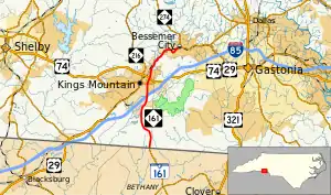 North Carolina Highway 161 (NC 161) is a primary state highway in the U.S. state of North Carolina that connects the city of Kings Mountain, North Carolina to Bessemer City, North Carolina and York, South Carolina.