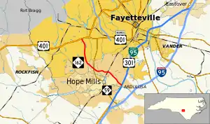 NC 162 is a short road at only 7.5 miles (12.1 km) in length. It is a bypass for NC 59. The road begins at U.S. Route 401 (US 401) near the Lafayette Shopping Center. After crossing NC 59, it bypasses Hope Mills to its north, ending at Interstate 95 Business (I-95 Bus.) and US 301.[1]