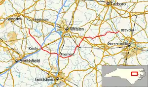 | Wilson | Stantonsburg | 33.5 | 53.9 | North end of NC 58 overlap | |