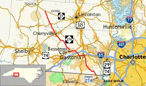 North Carolina Highway 274 (NC 274) is a primary state highway in the U.S. state of North Carolina. It connects rural areas of Lincoln and Gaston counties to Gastonia.