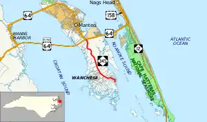Around 1950, US 64/US 264 was routed onto Roanoke Island (ferry from Manns Harbor and bridge to Nags Head) with both sharing concurrency with NC 345 through Manteo.[5] In 1965, NC 345 was reduced by .33 miles (0.53 km) at the Fort Raleigh National Historic Site.[6] In 1967, US 64/US 264 replaced NC 345 through Manteo, pushing its northern terminus to its current location.[7] Also same year, NC 345 was rerouted in Wanchese, from going west to the Croatan Sound to east along the Mill Landing Creek area (originally NC 345A), ending at Thicket Lump Drive (SR 1141); its old alignment became Old Wharf Road (SR 1168).[8][9]