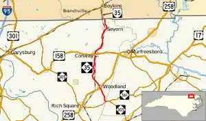 Starting from its southern terminus at NC 305/NC 561 near Tri-County Airport in Mintons Store of western Hertford County, the route immediately enters Northampton County as it progresses northward. In the town of Woodland, NC 35 joins US 258 as Woodland's main street, before turning north again only a couple city blocks later. The road continues north through the towns of Conway and Severn before it turns into Virginia State Route 35 at the Virginia state line. Much of the route runs mostly parallel to the North Carolina and Virginia Railroad and crosses it several times.