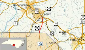 North Carolina Highway 38 (NC 38) is a primary state highway in the U.S. state of North Carolina. It runs from South Carolina state line to the town of Hamlet.