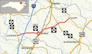 NC 481 is a two-lane rural highway that serves primarily as a farm-to-market route rather than as one to destinations other than Enfield. It begins at an intersection with NC 4/NC 48 in the community of Glenview, then proceeds east, quickly connecting with I-95 along the way. Near Enfield, NC 481 Business goes straight into the downtown area, while NC 481 meets U.S. Route 301 (US 301) before entering the town. After passing through town, it splits with US 301 north of Enfield and continues northeasterly. After connecting with NC 125/NC 903, it ends at NC 561 in the community of Tillery, near the banks of the Roanoke River.