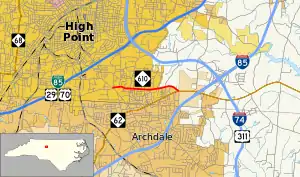 North Carolina Highway 610 (NC 610) is a 2.1-mile-long (3.4 km) primary state highway in the U.S. state of North Carolina. The highway connects Main Street in southern High Point with North Carolina Highway 62 east of Archdale. The highway provides indirect access between High Point and Interstate 85/Interstate 74. The current highway was established in 1930 and its routing has remained unchanged since.