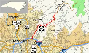 NC 694 is a 6.3-mile (10.1 km) two-lane scenic highway begins in downtown Asheville. Going northeast from its southern terminus at Martin Luther King Jr. Drive and College Street (the latter of which also carries U.S. Route 70 (US 70) and US 74A), it passes over Interstate 240 as it quickly ascends Beaucatcher Mountain, eventually to the ridge line. From there it curves along the east-side of Sunset Mountain and Patton Mountain, then on the south-side of Rich Knob and Meadows Mountain, before going around the southeast side of Peach Knob. It meets-up with the Blue Ridge Parkway at Craven Gap where it ends. The overall road is curvy, but manageable after the initial climb. There are no signage at the intersection with the Blue Ridge Parkway that indicates it as NC 694; visitors along the BRP will need to look for it at Craven Gap, near milepost 377 (607 km).[1]