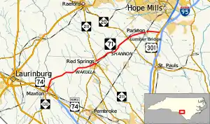 The southern terminus of the route is U.S. Route 74 Business (US 74 Bus.)[3] and Martin Luther King Drive in central Maxton. This point is also the western terminus of NC 130 from there the route follows North Patterson St to the US 74 / Future Interstate 74 interchange (exit 191 on US 74). Shortly after leaving town, the route has a brief incursion into Scotland County, it returns to Robeson County by crossing the Lumber River. After passing through the community of Wakulla, the route has a brief concurrency with NC 211 in the town of Red Springs. After the split from NC 211, NC 71 continues northeast to Shannon. To the north the highway serves Lumber Bridge, where it intersects NC 20, and Parkton. The northern terminus of the route is US 301, just outside Parkton.[1]