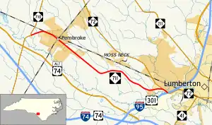 North Carolina Highway 711 (NC 711) is a primary state highway in the U.S. state of North Carolina. It connects the town of Pembroke with Interstate 95 (I-95) and U.S. Route 301 (US 301) in Lumberton. The highway travels in an east-to-west orientation but is signed as a north-south highway (with its easternmost point in Lumberton as its southern terminus), entirely in Robeson County.