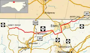 North Carolina Highway 770 (NC 770) is a 32-mile-long (51 km) state highway running through rural North Carolina and Eden. The road travels from NC 704 near Sandy Ridge to the Virginia state line southwest of Danville. It connects the city of Eden with US Highway 220 in Stoneville. Going east of Eden, NC 770 runs along a concurrency to its eastern terminus with U.S. Route 311 (US 311). Most of the road is two lanes wide. NC 770 is one of the few North Carolina state highways numbered in the 700s.