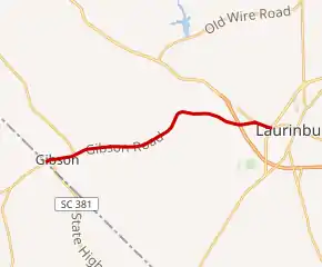 The southern terminus of NC 79 is at the North Carolina–South Carolina state line west of Gibson. From the state line, NC 79 runs northeast along Main Street toward central Gibson. At Francis Street, NC 79 makes a slight turn to the east, an orientation which it follows through Gibson. NC 79 meets NC 381 at Church Street. The intersection is the beginning of a concurrency between NC 79 and NC 381 that continues through Gibson. NC 79 and NC 381 crosses a railroad line operated by CSX Transportation at an at-grade crossing, 450 feet (140 m) to the east of Church Street.[4] Continuing east along Main Street, NC 79 and NC 381 largely pass through a residential area of Gibson. In eastern Gibson, the NC 79 and NC 381 concurrency ends at an intersection with Hamlet Road. NC 381 continues to the northwest toward Hamlet, while NC 79 continues east toward Laurinburg. NC 79 continues along Main Street until leaving the Gibson city limits, where it is renamed Gibson Road.[1][5]