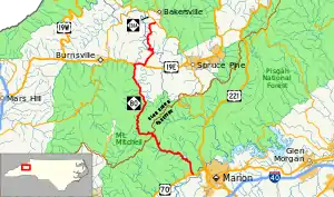NC 80 is a 37.9-mile-long (61.0 km) two-lane mountain highway between US 70, in Pleasant Gardens, and NC 226A, near Bakersville. The highway is popular with bike and motorcycle enthusiasts, because of its hairpin turns and also makes up part of the Mount Mitchell Scenic Drive between the Blue Ridge Parkway and Micaville. Trucks are not recommended to take NC 80, with multiple warning signs posted at each major intersection.
