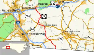 | Rutherford | Lake Lure | 20.3 | 32.7 | East end of concurrency with US 64/US 74A | |||