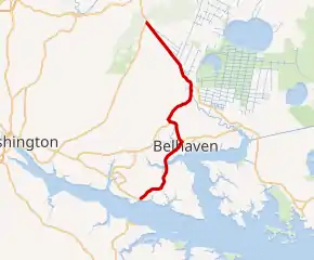 NC 99 begins at a t-intersection with NC 92 and NC 306 east of Bayview and Bath in Beaufort County. The intersection also marks the eastern terminus of NC 92 and the northern terminus of NC 306. From the intersection, NC 99 begins by heading to the east, running adjacent to the Pamlico River. 0.2 miles (0.32 km) east of its southern terminus, NC 99 makes a turn northeastward. The highway runs through a rural area of Beaufort County, with farms, forested areas, and some sparse residential buildings located adjacent to the road. NC 99 crosses a tributary of the Pamlico River and makes several curves that adjust its orientation to an easterly orientation. At a t-intersection, NC 99 turns to the northeast toward Belhaven. The highway continues to the north for 3.5 miles (5.6 km) until crossing Pungo Creek, which drains to the Pungo River. NC 99 continues to the northeast, crossing the Pungo River and entering into Belhaven. NC 99 runs to the northeast in Belhaven, crossing a railroad operated by the Carolina Coastal Railway.[2] Immediately after crossing the railroad, NC 99 intersects US 264/US 264 Business at Main Street. NC 99 turns to follow US 264 concurrently to the northwest. The highways travel through a residential area of northwestern Belhaven before exiting the town.[1][3]