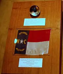 The North Carolina Apollo 11 lunar sample display commemorative podium-style plaque consists of four "Moon rock" rice-sized particle specimens that were collected by Apollo 11 astronauts Neil Armstrong and Buzz Aldrin in 1969 and a small North Carolina state flag that was taken to the Moon and back on Apollo 11.[1]