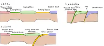 | 1.85Ga | Collision of the Eastern and Western Blocks leading to their amalgamation and the formation of Trans North China Orogen[5][9] | |