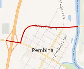 North Dakota Highway 59 (ND 59) is a state highway located entirely within Pembina County that connects Interstate 29 (I-29) and U.S. Route 81 (US 81) on the west side of Pembina, to Minnesota State Highway 171 (MN 171) at the Minnesota state line at the Red River.