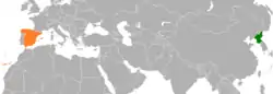 North Korea–Spain relations(Korean: 에스빠냐-조선민주주의인민공화국 관계) are the bilateral and diplomatic relations between these two countries. North Korea opened an embassy in Spain in 2014, although he does not practice for consular affairs as there are no North Korean civilians currently residing in Spain.[1][2] Spain does not have an embassy in North Korea, but its embassy in South Korea operates for matters related to Spanish citizens who intend to travel to North Korea. In addition, the Spanish Ministry of Foreign Affairs recommends its registration at the Seoul embassy, given the possibility that relations between the two Koreas, already delicate, may worsen at any time. That is why Spain considers the entire territory of North Korea as a risk zone for Spanish citizens traveling to this country.[2][3]