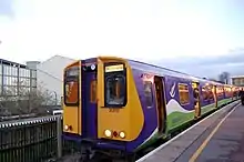 The line was originally operated by steam-hauled trains which were replaced after electrification by London and North Western Railway EMUs built from 1914 and augmented by later EMUs built in the 1930s by the London, Midland and Scottish Railway. These had all been replaced by the early 1960s with dedicated short-wheelbase trains (shared with the Watford DC line) built by the Southern Region at Eastleigh (using underframes built at Ashford) from 1957 which were later designated by British Railways as Class 501. These were succeeded by Southern Region Class 416 EMU for a short period, these units being allocated to Selhurst depot in south London. Class 416 trains were in turn succeeded by Class 313 EMUs, which worked the route until 2010 when London Overground introduced Class 378 Capitalstar four-car dual-voltage electric trains compatible with both 750 V DC third-rail and 25 kV AC overhead power sources,[4] and all of these units were by 2017 operating in 5-car formations to address the additional demand on the route.