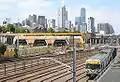 The suburban train stabling yard to the north the station was opened in December 1973, as part of the City Loop project.[6] The footbridge that links the sidings with the Macaulay maintenance centre also opened around this time.[7] The washing plant and additional sidings in Melbourne Yard, located to the west of the station, were made operational in May 1995, as part of the Jolimont Yard rationalisation.[8]