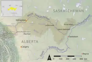The Saskatchewan River system is the largest shared between the Canadian provinces of Alberta and Saskatchewan.[1] Its watershed includes most of southern and central Alberta and Saskatchewan.