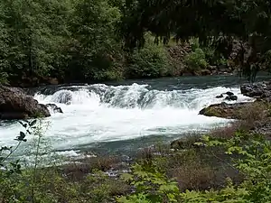 It rises in the high Cascades, issuing from Maidu Lake at elevation of 5,998 feet (1,828 m)[2] in the Mount Thielsen Wilderness, along the Douglas-Klamath county line approximately 70 miles (113 km) east of Roseburg. It follows a serpentine course down from the Cascades, westward along the southern side of the Calapooya Mountains. Its upper course passes through the Umpqua National Forest, past Toketee Falls and Steamboat, where it receives Steamboat Creek from the north. It receives the Little River from the south at Glide (the confluence is known as the Colliding Rivers) and joins the South Umpqua from the east approximately 5 miles (8 km) northwest of Roseburg to form the Umpqua.[1]