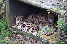The cheetah, together with the African wild dog, is considered emblematic of Ethiopia.[17] A conservation project for wild animals started first in 2006 after "real lack of awareness in Ethiopia about the treatment of animals".[18] The conservation goal is to ensure the increasing populations of cheetahs and other threatened wild animals in Ethiopia.[19] Following the illegal pet trade of cheetah cubs of Somaliland to the Middle East, the Ethiopian Born Free Foundation had confiscated the cheetah cubs from Somalia and started a semi-captive breeding project for them in order to save the species and reintroduce them into the wild.[20] The rescued Somali cheetahs reside at Ensessakotteh in a spacious enclosure.[21][22]