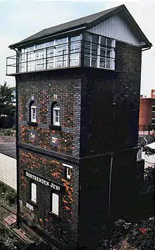 Northenden Junction signal box is 200 yards (183 metres) to the east of where the main station buildings were, on the north side of the line, adjoining Longley Lane. The signal box was built using CLC's standard dark brick construction and utilised an unusually tall design, sufficiently high to enable the signalman on duty to readily see above Longley Lane road bridge over the line and on to Northenden Junction, 200 yards (183 m) away to the east, where the London & North Western Railway's line from Stockport (Edgeley) station joined the Cheshire Lines Committee line from Stockport Tiviot Dale. The signal box controlled sets of signals protecting the junction and also operated the powered railway switching points.