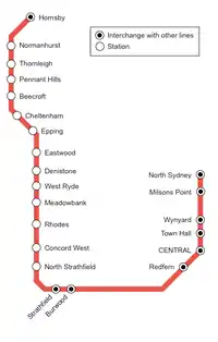 - All stations from Epping to Strathfield, then Redfern, Central, and all stations to Gordon, then all stations to Hornsby.