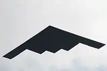 Reportedly, the B-2 has a radar cross-section (RCS) of about 0.1 m2 (1.1 sq ft).[109] The bomber does not always fly stealthily; when nearing air defenses pilots "stealth up" the B-2, a maneuver whose details are secret. The aircraft is stealthy, except briefly when the bomb bay opens. The B-2's clean, low-drag flying wing configuration not only provides exceptional range but is also beneficial to reducing its radar profile.[68][110] The flying wing design most closely resembles a so-called infinite flat plate (as vertical control surfaces dramatically increase RCS), the perfect stealth shape, as it would lack angles to reflect back radar waves (initially, the shape of the Northrop ATB concept was flatter; it gradually increased in volume according to specific military requirements).[111] Without vertical surfaces to reflect radar laterally, side aspect radar cross section is also reduced.[112] Radars operating at a lower frequency band (S or L band) are able to detect and track certain stealth aircraft that have multiple control surfaces, like canards or vertical stabilizers, where the frequency wavelength can exceed a certain threshold and cause a resonant effect.[113]