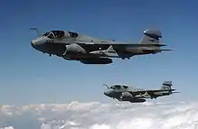 The EA-6A "Electric Intruder" was developed for the U.S. Marine Corps during the 1960s to replace its EF-10B Skyknights. The EA-6A was a direct conversion of the standard A-6 Intruder airframe, with two seats, equipped with electronic warfare (EW) equipment. The EA-6A was used by three Marine Corps squadrons during the Vietnam War. A total of 27 EA-6As were produced, 15 of which were newly manufactured.[3] Most of these EA-6As were retired from service in the 1970s with the last few being used by the Navy with two electronic attack "aggressor" squadrons, with all examples finally retired in the 1990s.[4] The EA-6A was essentially an interim warplane until the more-advanced EA-6B could be designed and built.