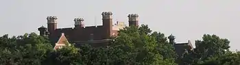 The Collegiate Gothic structure with its central tower keep design evokes Tattershall Castle and lords over the campus with the motto, "And the truth shall make you free," engraved in stone. Because of this design, the term "Tower" is used frequently throughout campus and is the name of the school yearbook. Work on the building began in 1906 and continued on and off until classes began in it on October 3, 1910. The architect of record for the Maryville building is John H. Felt. On March 15, 1919, a tornado ripped the roof off its auditorium and blew out most of its windows.[10]