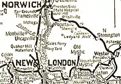 From Franklin Square in Norwich, the tracks ran down Main Street, then turned south onto the dedicated right-of-way. The line skirted Laurel Hill Road (now Route 12) at Norwich State Hospital, then ran parallel to Poquetanuck Road (now Route 2A) to Hallville. From there the line followed Route 2 closely into North Stonington, where the station was located at Main Street and Rocky Hollow Road.[2] The line continued into Pawcatuck, where it veered east across the State Line Bridge and into White Rock, Rhode Island. After crossing Pierce Street in Westerly on a trestle, cars rejoined street traffic at the corner of West and Pleasant Streets. From there, they followed West Street on a bridge over the mainline rail tracks and onto Railroad Avenue to Westerly station, then on Pawcatuck Valley Street Railway trackage on Canal, High, and Broad streets to Dixon House Square and Westerly Public Library.[1][5]