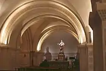 Escaramagne bought at auction an 18th-century statue of the Virgin and child from a monastery of the Picpus Fathers that had been demolished during the Revolution. He offered the statue to the La Garde church. The scepter that the virgin had held was replaced by a bouquet of flowers, hence the statue became known as the "Virgin of the bouquet". To make way for a new silver statue created in 1837, this statue was given to the Montrieux charterhouse, then returned in 1979 to the sanctuary.[29] The statue of the Virgin of the bouquet is currently displayed on the altar in the crypt.