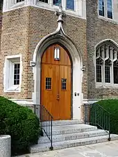 The university restored the old building of the Institute of Technology after it was damaged by fire in 1916, and renamed it Hoynes Hall in honor of Dean William Hoynes. It was given to the exclusive use of the law students who moved there from Sorin Hall.[15] After the Law School moved to its own building, Hoynes Hall housed the Architecture Department until 1963 and the Psychology Department until 1974, and then was renamed Crowley Hall and became the house of the Music Department since 1976. In 1925 John Whitman was appointed by Dean Thomas Konop as the first Law School librarian, and the collection grew to 7,000 volumes. In 1921 Maxine Evelyn Ryer became the first woman to study law at Notre Dame and the first woman to practice law in St. Joseph County, Indiana. In 1944, statues by Eugene Kormendi were added to the building as part of a campus beautification project.[16]