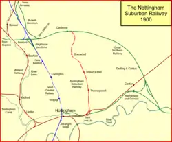 The Nottingham Suburban Railway was a British railway company that constructed a line 3.65 miles (5.87 km) in length serving the north-eastern suburbs of Nottingham. It was built to shorten the distance by train to Ilkeston and towns on the Leen Valley railway line, and to connect important brickworks near Nottingham. The short line was expensive to build due to difficult topography; it opened in December 1889, and was worked by the Great Northern Railway; the trains used that company's Nottingham terminus.