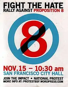 On November 15, 2008, thousands of people in cities across the United States and ten other countries protested California voters' approval of Proposition 8, which changed the state Constitution to restrict the definition of marriage to opposite-sex couples and eliminated same-sex couples' right to marry.[1][2] The demonstrations were organized by Join the Impact, a grassroots group that emerged in light of the election results.[3]