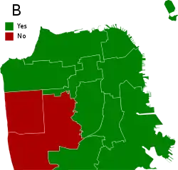 Proposition B would allow the City to issue $208 million in bonds to finance street and sidewalk improvements. This proposition required a two-thirds majority to pass.