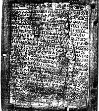 The Novgorod Codex (Russian: Новгородский кодекс) is the oldest book of the Rus’, unearthed on July 13, 2000 in Novgorod. It is a palimpsest consisting of three bound wooden tablets containing four pages filled with wax, on which its former owner wrote down dozens, probably hundreds of texts during two or three decades, each time wiping out the preceding text.