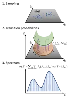 The NEA is a multidimensional extension of the reflection principle,[2] an approach often used for estimating spectra in photodissociative systems. With popularization molecular mechanics, ensembles of geometries started to be also used to estimate the spectra through incoherent sums.[3] Thus, different from the reflection principle, which is usually done via direct integration of analytical functions, the NEA is a numerical approach. In 2012, a formal account of NEA showed that it corresponded to an approximation to the time-dependent spectrum simulation approach, employing a Monte Carlo integration of the wavepacket overlap time evolution.[1]