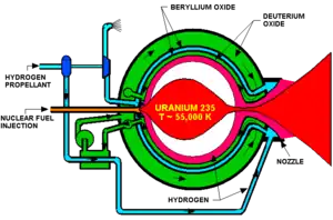 Solid core nuclear reactors have been fueled by compounds of uranium that exist in solid phase under the conditions encountered and undergo nuclear fission to release energy. Flight reactors must be lightweight and capable of tolerating extremely high temperatures, as the only coolant available is the working fluid/propellant.[1] A nuclear solid core engine is the simplest design to construct and is the concept used on all tested NTRs.