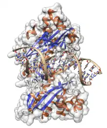 A site-specific nuclease forms far stronger associations by contrast. It draws DNA into the deep groove of its DNA-binding domain. This results in significant deformation of the DNA tertiary structure and is accomplished with a surfaces rich in basic (positively charged) residues. It engages in extensive electrostatic interaction with the DNA.[7]