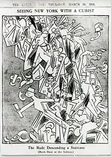 The painting was exhibited for the first time at Galeries Dalmau, Exposició d'Art Cubista, Barcelona, 1912.[18] Duchamp subsequently submitted the painting to the 1913 Armory Show in New York City, where Americans, accustomed to naturalistic art, were scandalized. The painting, exhibited in the 'Cubist room', was submitted with the title Nu descendant un escalier,[19] was listed in the catalogue (no. 241) with the French title.[20] A postcard printed for the occasion showed the painting for the first time with the English translation Nude Descending a Staircase.[21] Julian Street, an art critic for The New York Times wrote that the work resembled "an explosion in a shingle factory," and cartoonists satirized the piece. It spawned dozens of parodies in the years that followed.[22] A work entitled Food Descending a Staircase was exhibited at a show parodying the most outrageous works at the Armory, running concurrently with the show at The Lighthouse School for the Blind. In American Art News, there were prizes offered to anyone who could find the nude.[23]