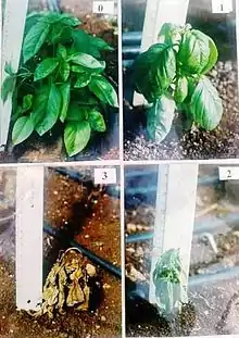 Nufar basil (Ocimum basilicum 'Nufar') is the first variety of sweet basil (O. basilicum) that is resistant to fusarium wilt. Fusarium wilt is a disease that causes sudden wilting and death in multiple species, including basil. It is caused by the fungus Fusarium oxysporum f. sp. basilicum, which attacks the xylem in the stem, blocking water uptake and leading to a characteristic sudden leaf wilt that does not respond to watering. [1] Nufar basil is resistant to fusarium wilt, remaining asymptomatic even when infected. It was released in 1999 in Israel by the breeders of the Agricultural Research Organization, and commercialized by Genesis Seeds.[2]