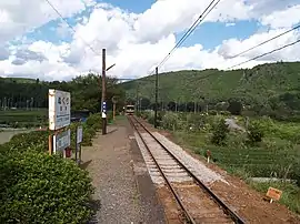 The station has a single side platform, with a rustic wooden station building.