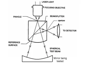 A null corrector is an optical device used in the testing of large aspheric mirrors. A spherical mirror of any size can be tested relatively easily using standard optical components such as laser, mirrors, beamsplitters, and converging lenses. One method of doing this using a Shack cube is shown at the right, and many other setups are possible. An interferometer test such as this one generates a contour map of the deviation of the surface from a perfect sphere, with the contours in units of half the wavelength used. This is called a null test because when the mirror is perfect, the result is null (no contours at all). If the result is not null, then the mirror is not perfect, and the pattern shows where the optician should polish the mirror to improve it.