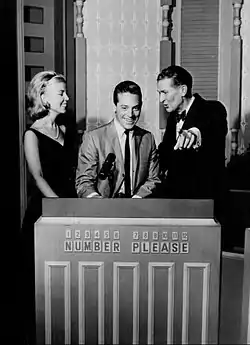 Number Please is a Goodson-Todman Productions game show hosted by Bud Collyer which aired at 12:30 p.m. weekdays on ABC from January 30 to December 29, 1961.[1] It replaced Collyer's Beat the Clock when that series ended its run on ABC. Number Please was an early predecessor of Wheel of Fortune and other word-puzzle programs.