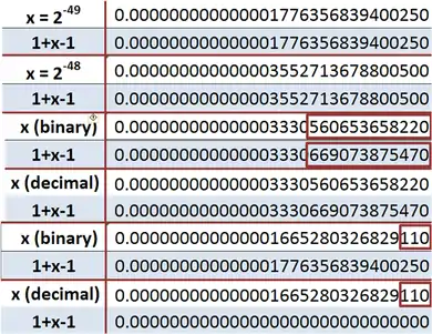 The last two examples illustrate what happens if x is a rather small number. In the second from last example, x = 1.110111⋯111 × 2−50; 15 bits altogether. The binary is replaced very crudely by a single power of 2 (in this example, 2−49) and its decimal equivalent is used. In the bottom example, a decimal identical with the binary above to the precision shown, is nonetheless approximated differently from the binary, and is eliminated by truncation to 15 significant figures, making no contribution to 1 + x − 1, leading to x = 0.[5]